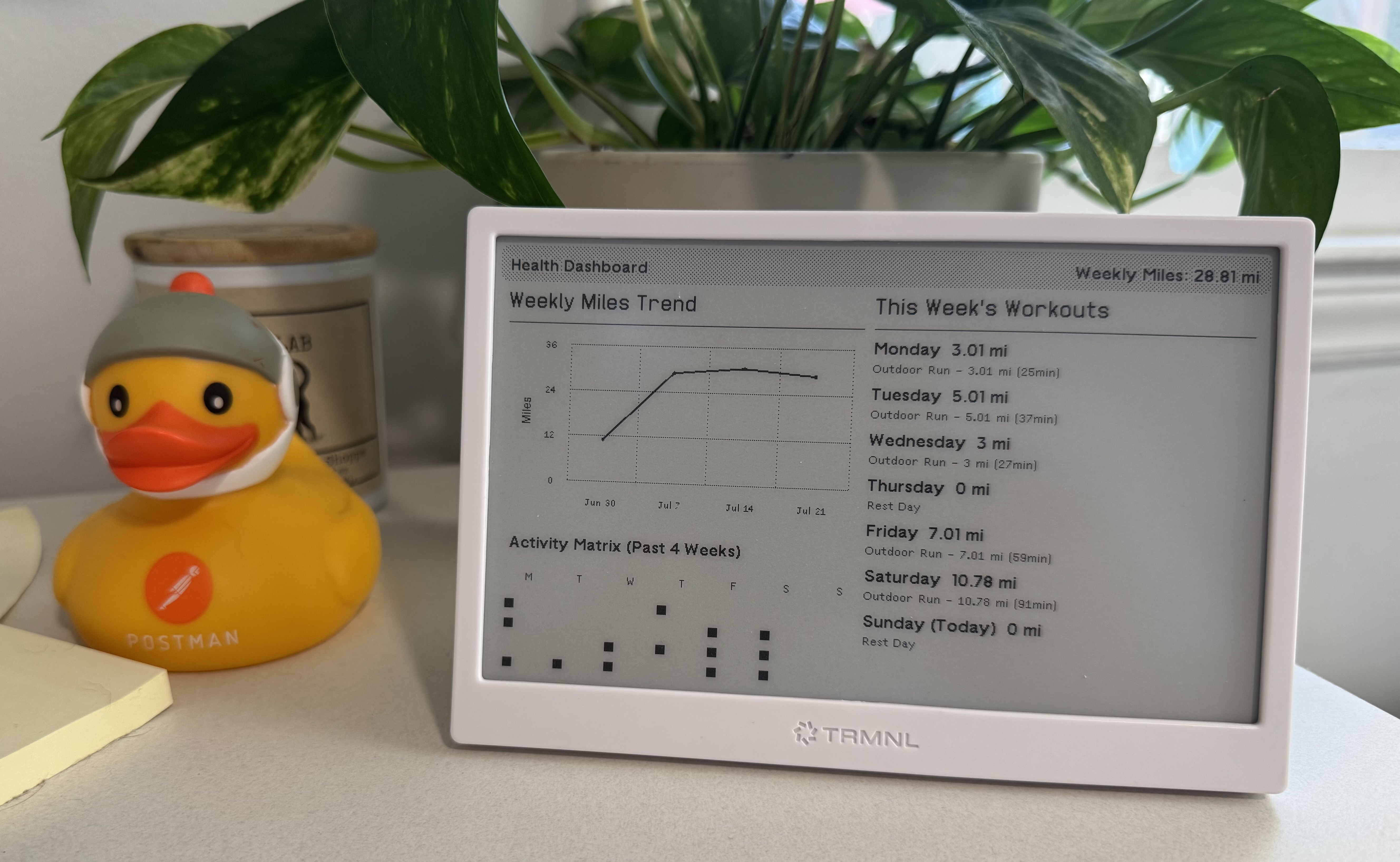 As someone trying to take running more seriously, a big factor is your weekly mileage. The best way to get faster is often to increase your total miles a week, but running too much is also a great way to get injured. Keeping track of your mileage in a glanceable dashboard seemed perfect. I had purchased a trmnl a while back, but it mostly sat unused in the drawer. It’s basically an e-ink screen similar to a Kindle, but can display HTML-rendered pages, auto-refreshing on a set timer. It seemed like a perfect solution to my mile monitoring needs. I’ve been tracking my runs on Strava for almost a decade now, but recent changes to their API made me hesitant to dive fully in. Instead, I wanted something I controlled more closely and opted for Apple Health, which gives me the added benefit of adding things in the future like sleep, alcohol, or other health metrics.